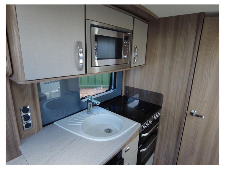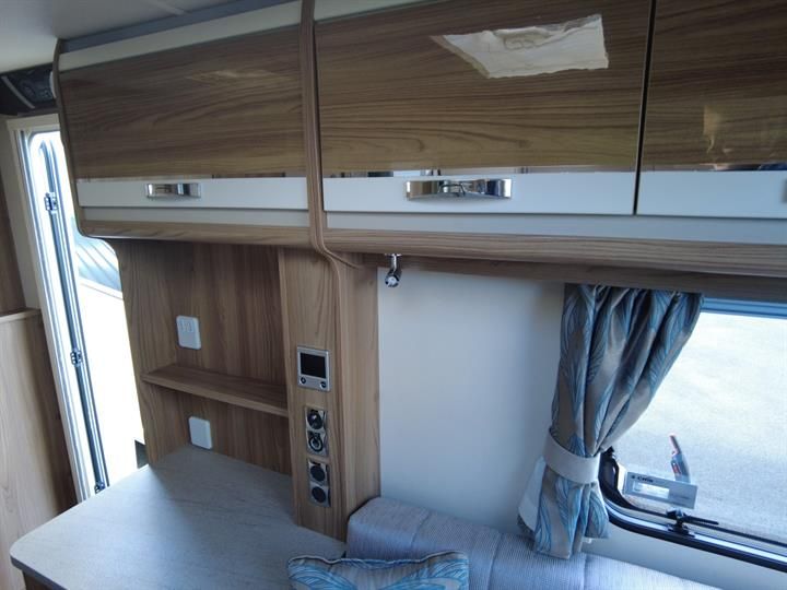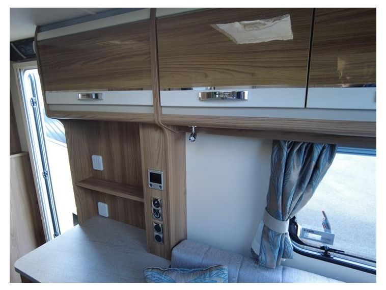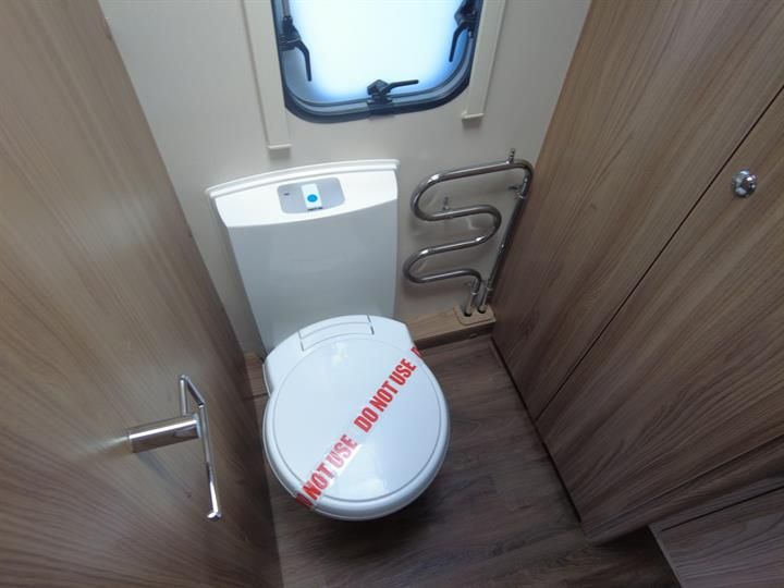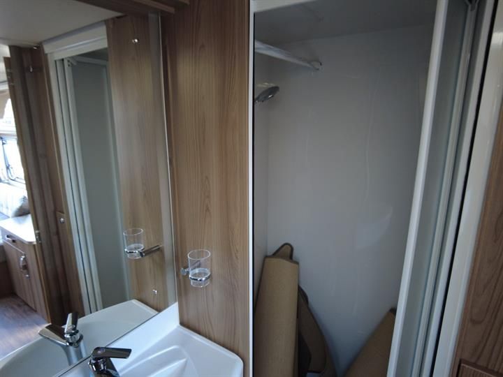 To the rear is an end washroom with cassette toilet, wash basin and a separate shower. There is also a large wardrobe and a heated towel rail.