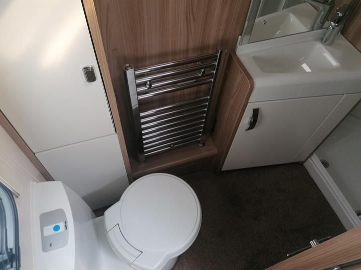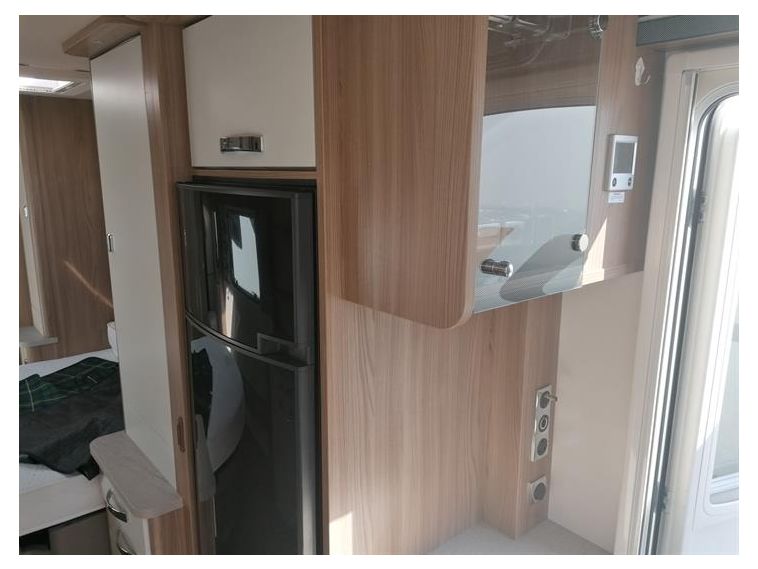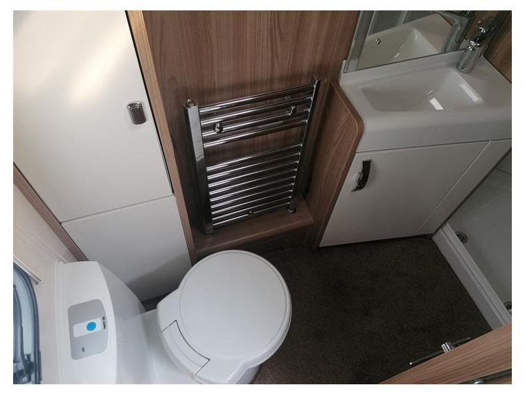 The kitchen area is fully fitted with eye level microwave, hobs, oven/grill and a 70/30 fridge/freezer opposite. The worktops have a clean white finish with a chrome sink and extendable worktop serving as useful features. There is also a wine rack.