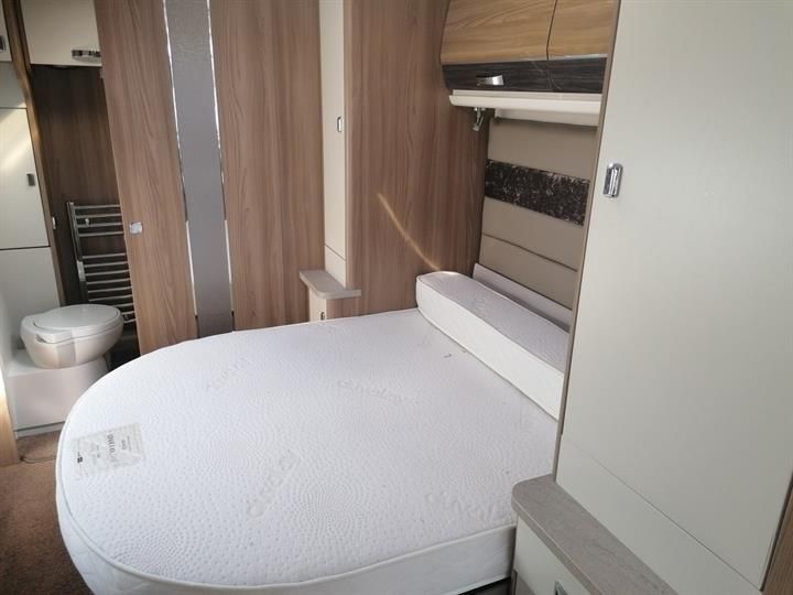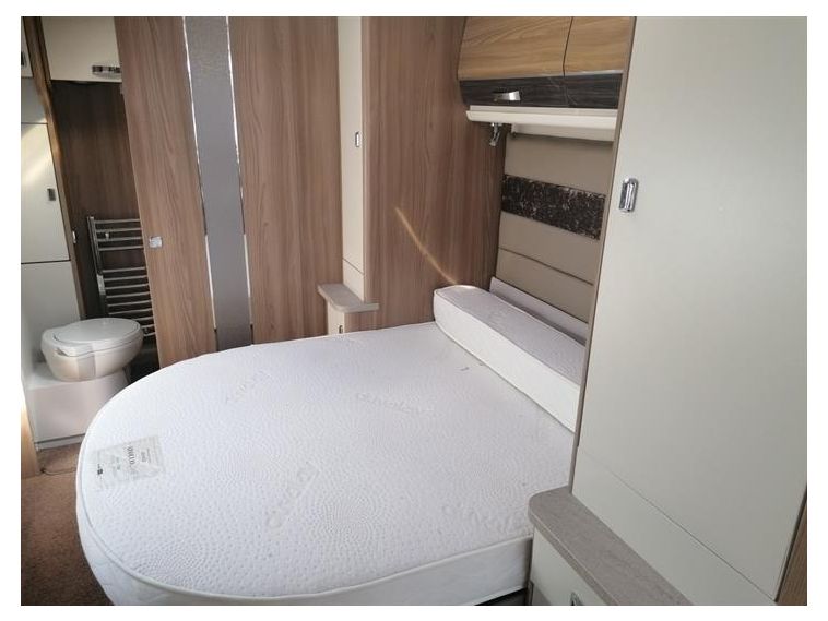 The bedroom area features a transverse island bed with a memory foam mattress atop. There are hers and his wardrobes either side of the bed with overhead storage lockers and space beneath ensuring you can take all of your essentials away with you on your travels.
