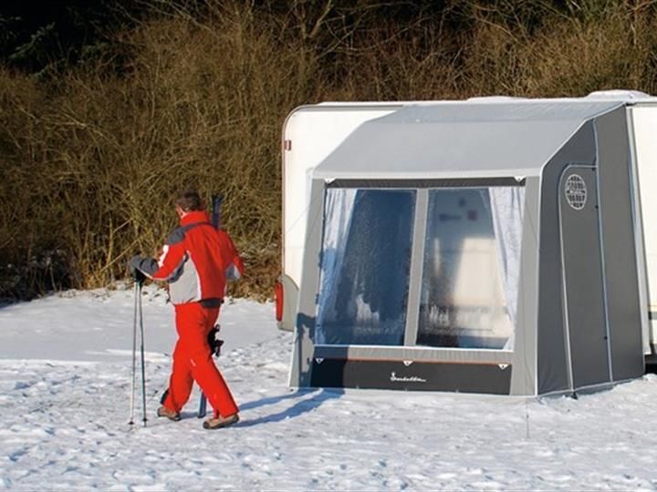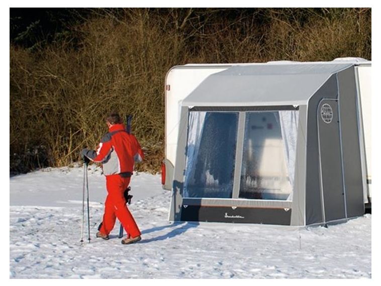 Thanks to the heavy-duty materials, a special roof angle to prevent the build-up of snow, an extra wide external mud flap, a strong steel frame, flexible pegging and window foil designed to withstand extreme temperatures, Isabella?s Winter awning will stay the course ? even in a heavy snow storm. The model is made of easy-to-clean polyester/PVC material and has doors in both sides as well as zipped ventilation.